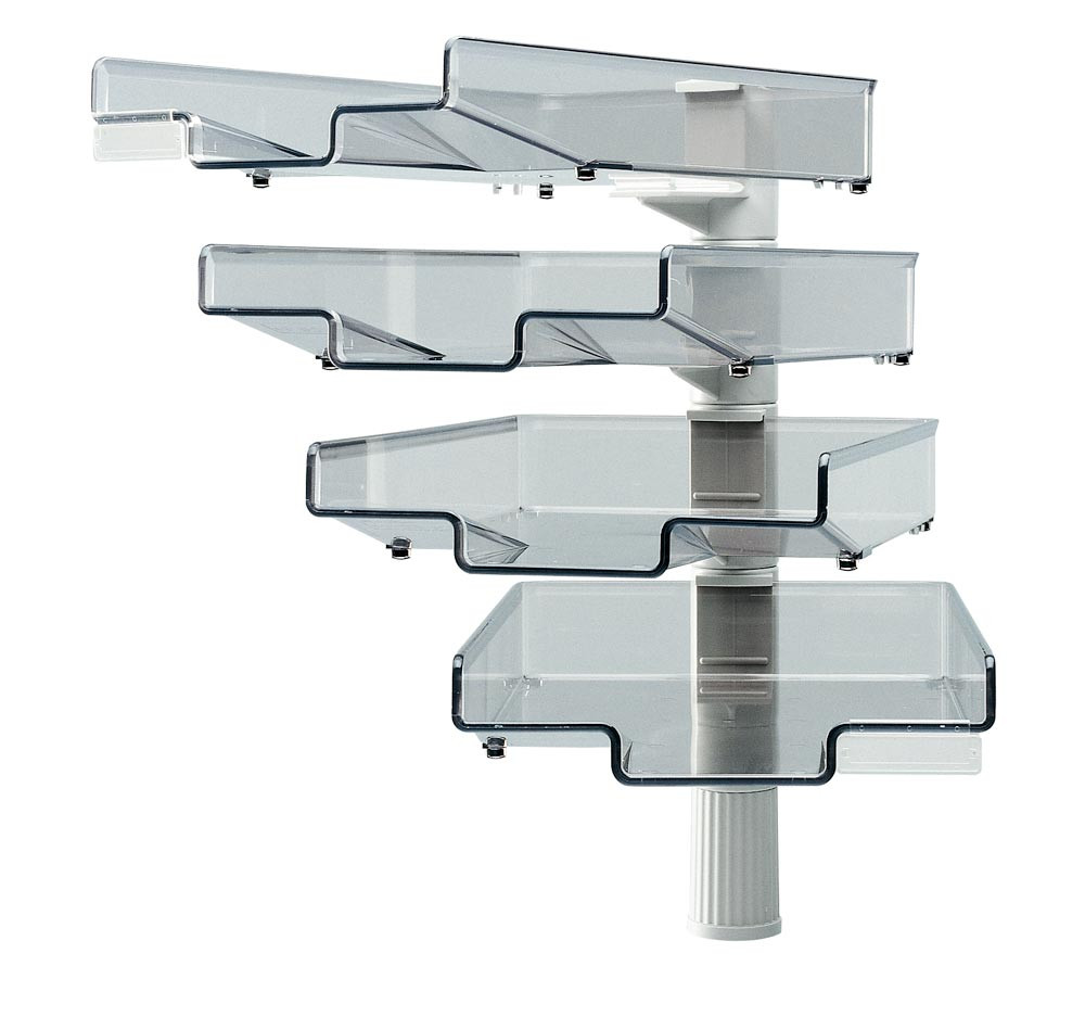 · Transparente Kunststoff-Ablagekörbe · Längs und quer montierbar · Schwenkbar um 360° · Geeignet für Unterlagen max. 240 x 340 mm · Befestigung am Tisch mit Klemmzwinge · Klemmbereich 20-72 mm
