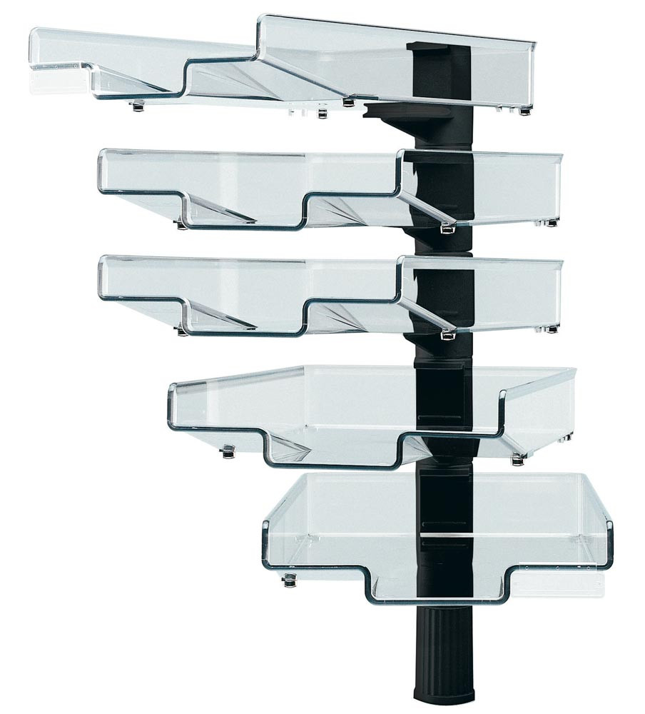 Ablagekorb-Tischständer, BxTxH 270x370x590 mm, 5 Kunststoffschalen transparent, Ständer schwarz