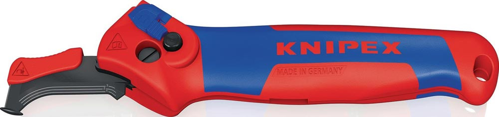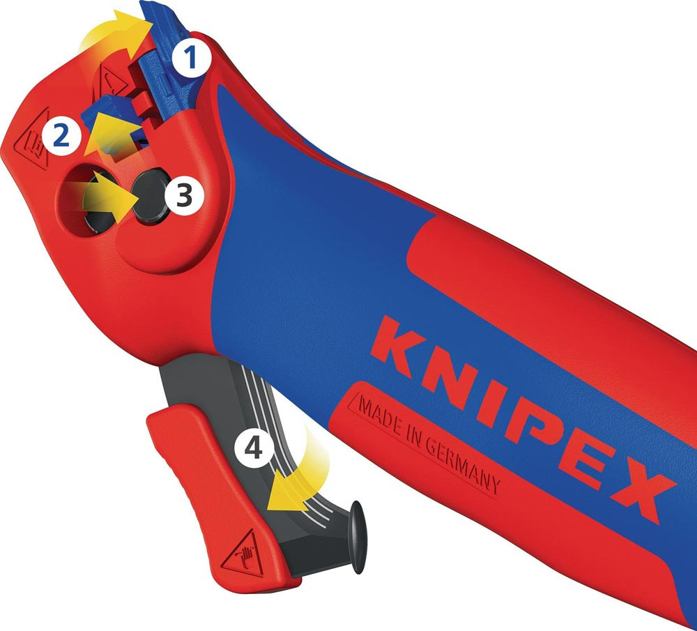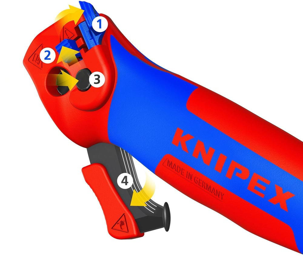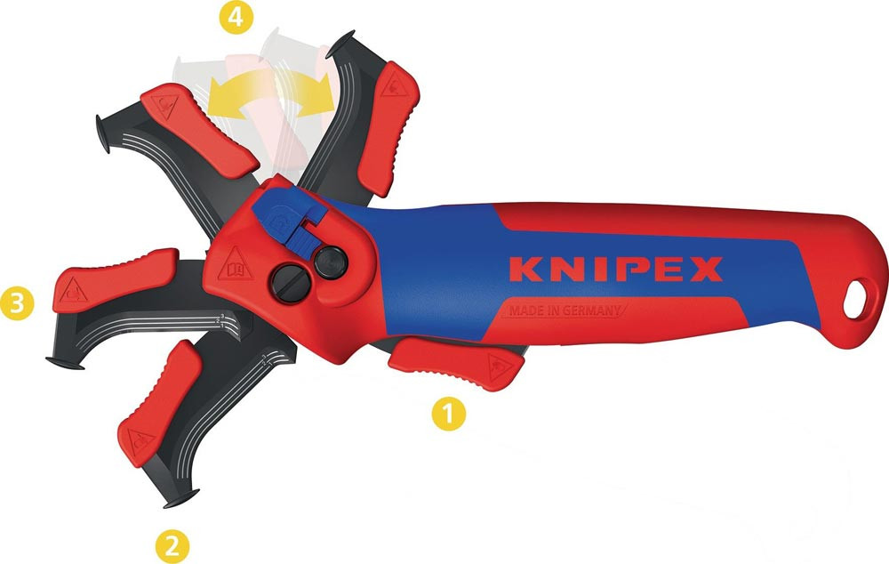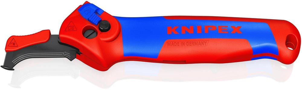 Ratschenfunktion: leichter Schnitt auch bei sehr robusten Kabelmänteln · vielseitige Klinge: mit drei Schneidbereichen für Umfangs- und Längsschnitt · Gleitschuh schützt die Leiterisolationen unter dem Mantel · trennt auch sehr harte oder zähe Kunststoffmäntel bis 7 mm Wandstärke · wechselbare Hakenklinge: sichelförmig · stabil und einklappbar für den Transport · Klinge mit 4 Rastpositionen: eingeklappt, gerade, angewinkelt und beweglich · dreistufige Klingensicherung für sichere Handhabung und Transport · ergonomisch gestaltete Griffform mit angenehmer Haptik · mit integrierter Befestigungsöse zum Anbringen einer Absturzsicherung