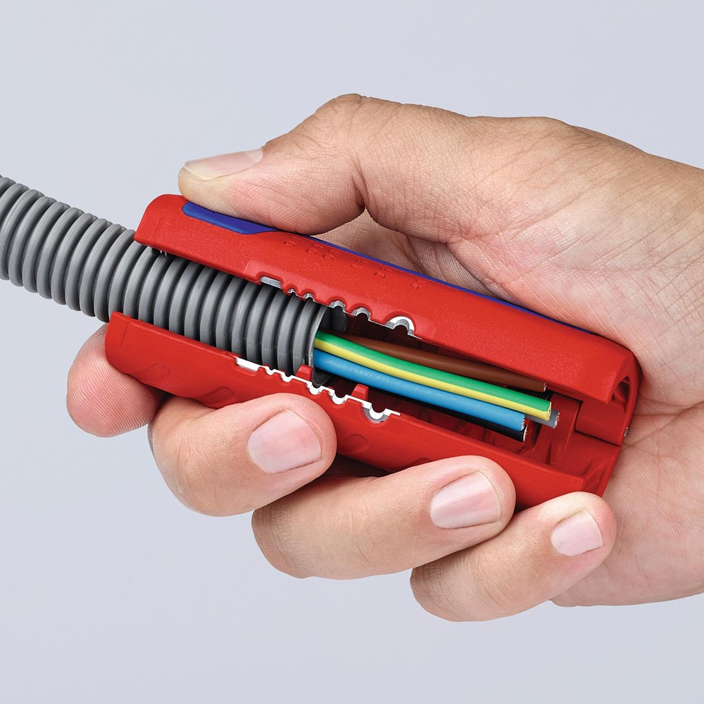 Wellrohrschneider · zum Ablängen von leeren oder fertig konfektionierten Wellrohren · doppelseitige Führung für präzisen Schnitt · Gehäuse aus stabilem Polyamid-Compound-Kunststoff