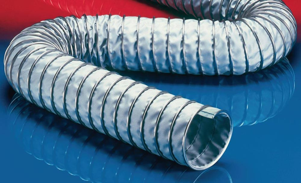 Hochtemperaturschlauch, Klemmprofilschlauch, (bis +500°C) Anwendungen: · flexibler Schlauch für heiße und kalte Gase · Motorprüfstand, Abgasmessung · Hochtemperaturabsaugung: Ofen, Gießerei, Hochofen, Schmelze, Keramikindustrie, Glasindustrie, Stahlwerk, Aluminiumhütte · Faltenbalg, Kompensator Eigenschaften: Scheuerschutz durch äußeres Klemmprofil · zugfeste Verklemmung der Wandung im Klemmprofil · hochflexibel + stauchbar · sehr gut hitzebeständig · RoHS konform Temperaturbereich: · -60°C bis 450°C · kurzzeitig bis 500°C