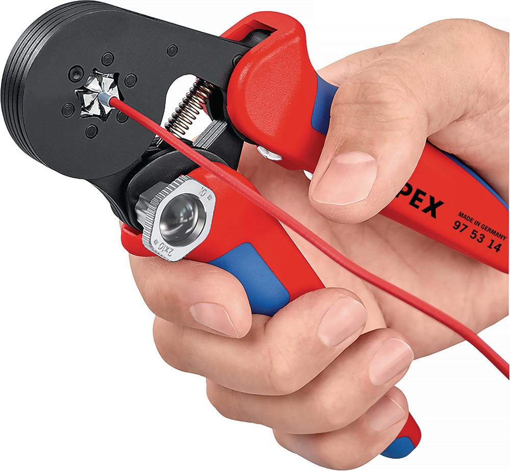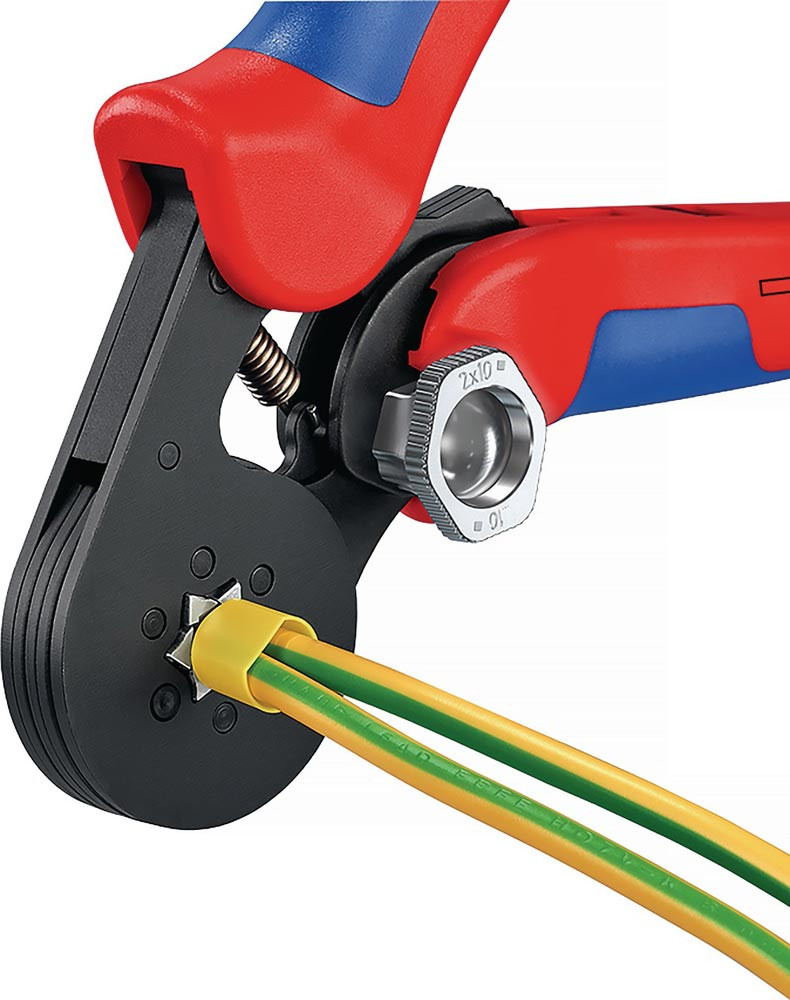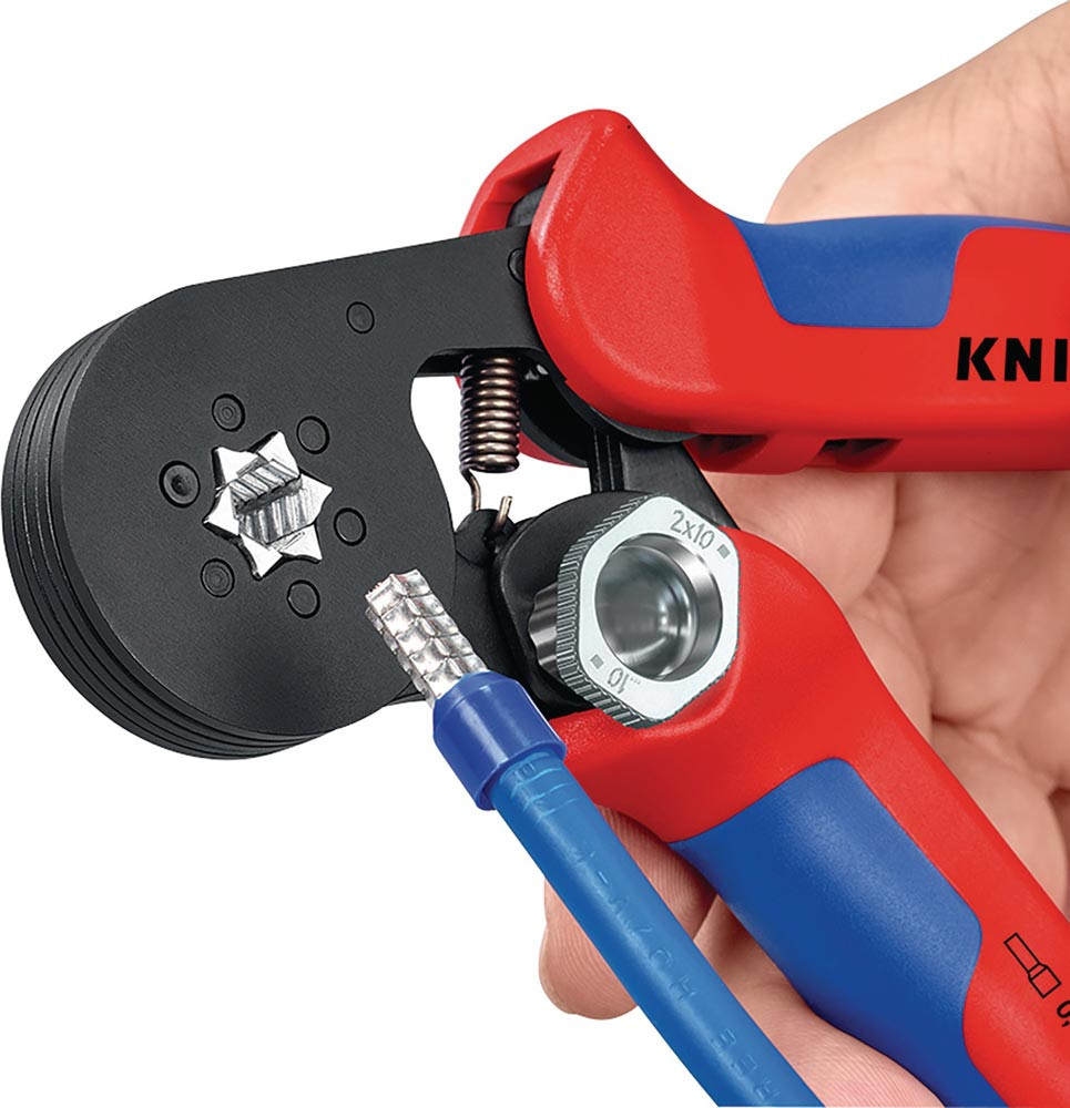 selbsteinstellend · für Aderendhülsen · mit Seiteneinführung · zum Verpressen von Aderendhülsen nach DIN 46228 (Teil 1 + 4) · für beengte Anschlussmaße · mit dem selbsteinstellenden Sechskant-Crimpprofil werden Aderendhülsen einfach, schnell und zuverlässig vercrimpt · Chrom-Vanadin-Elektrostahl in Sondergüte, ölgehärtet · Sechskantcrimpung, für Twin-Aderendhülsen bis 2 x 10 mm², mit Umschalthebel für 16 mm²
