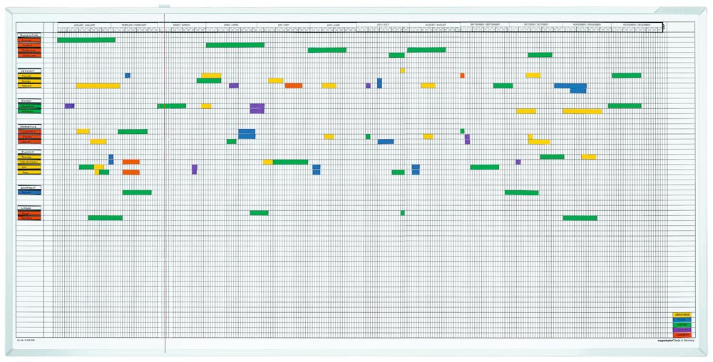 Mit diesem Planer haben Sie die Projekte oder Urlaubszeiten eines ganzen Jahres vor Augen, denn eine genaue Vorplanung und Koordination vermeidet Produktionsengpässe und Unterbelegungen. Optimal zur Terminplanung von Projekten, Messen, Seminaren und Produktionsabläufen oder zur Personalplanung mit Urlaub, Dienstreisen etc.