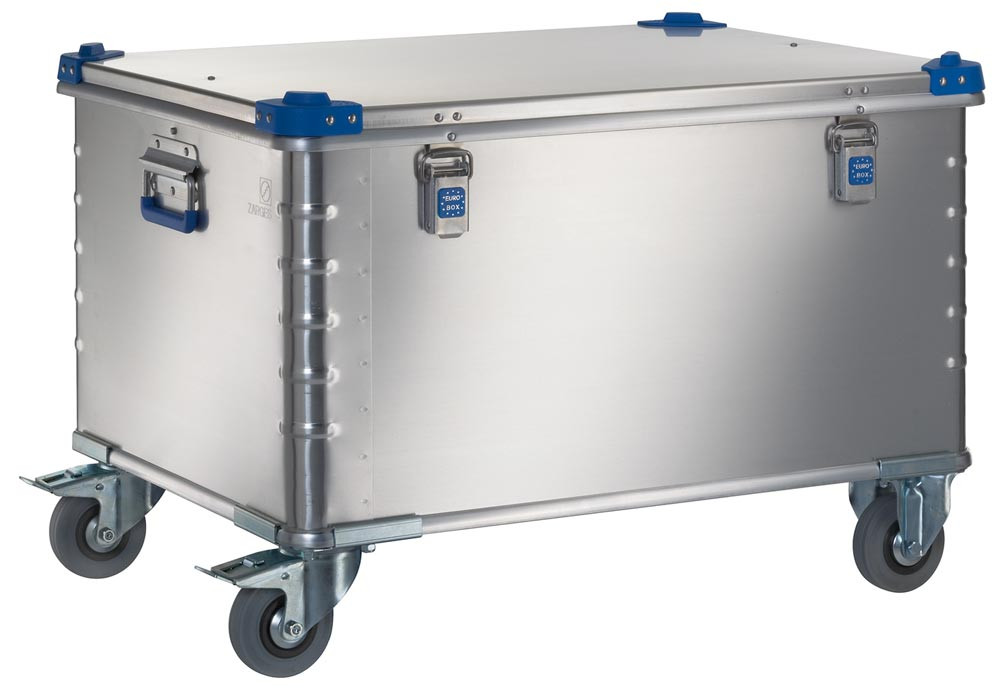 ∙ Transportkisten aus Alulegierung mit stabilem Boden-, Rand- und Deckelprofil, Ecksicke ∙ Deckel mit Edelstahl-Scharnieren und zwei Haltegurten ∙ Umlaufend angeschäumte Deckeldichtung ∙ Rutschsichere Stapelecken aus schlagzähem Kunststoff ∙ Sicherung durch Plomben, Vorhängeschloss und Schlosseinbau · Abschließbare Ausführung auf Anfrage