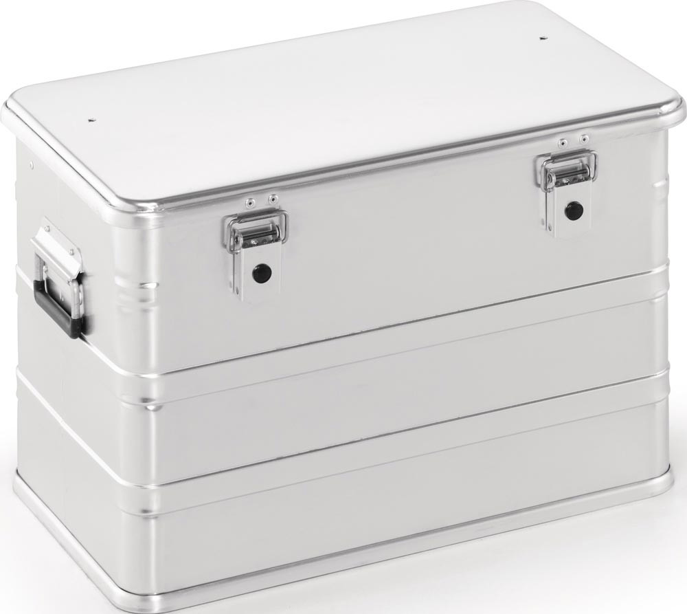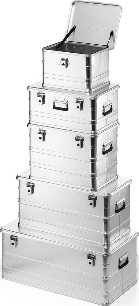 ideal für den Transport von empfindlichen und schweren Produkten wie Werkzeuge, Fotogeräte usw. · sehr robuste Transportboxen aus 1 mm starkem Aluminiumblech · leicht, stabil und formbeständig durch umlaufende Sicken · korrosions-, witterungs- und temperaturbeständig · umlaufende Gummidichtung im Kastenprofil zum Schutz vor Staub und Wasser · stabiler Klappdeckel mit Fangbändern, verhindern ein Ausreißen der Scharniere · selbsteinklappende Sicherheitshandgriffe kunststoffummantelt für bequemen Transport · stabile Klapphebelspannverschlüsse mit Bohrungen für Vorhängeschloss oder Plombenverschluss und vorbereitet für die Montage von Zylinderschlössern (siehe Zubehör) · Temperaturbereich: -40 °C bis +180 °C