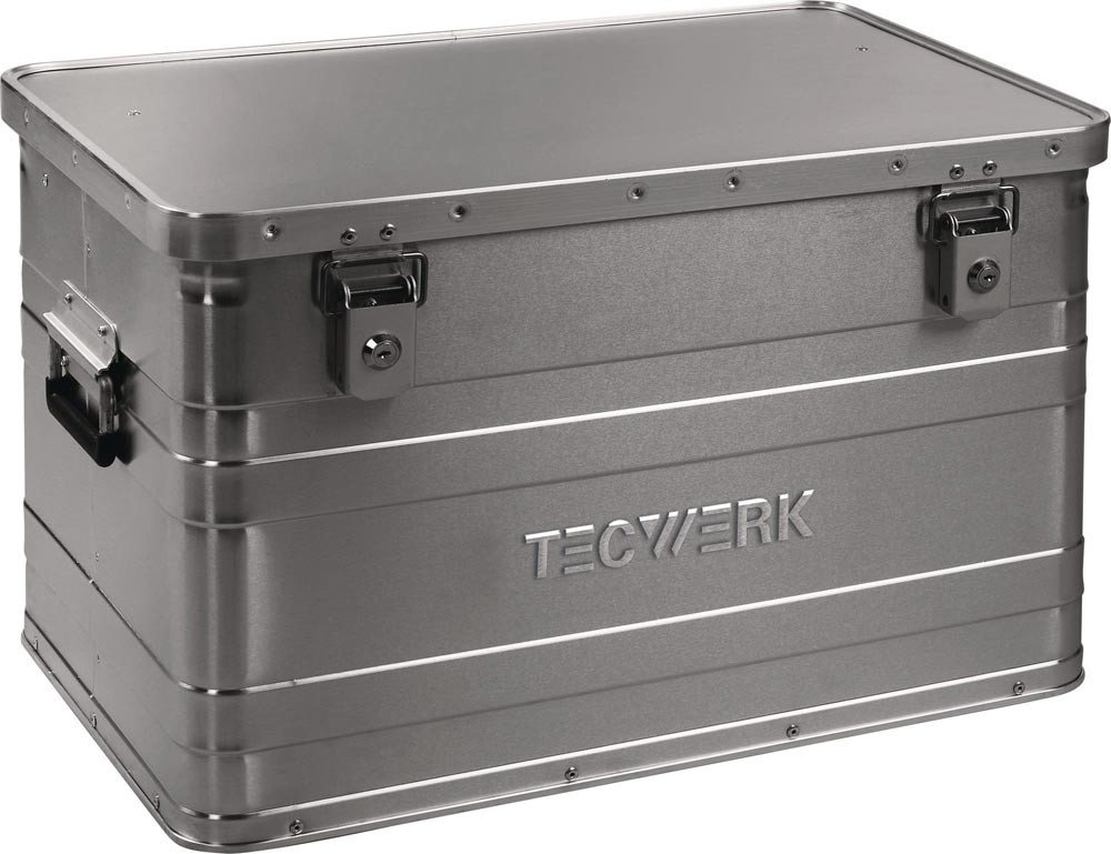 die Aluminiumboxen der Marke TECWERK sind witterungs-, temperatur- und korrosionsbeständig · Hebelspannverschlüsse mit 2 gleichschließenden Zylinderschlössern und Bohrungen für Plomben oder Vorhängeschloss · staub- und spritzwassergeschützt durch umlaufende Gummidichtung im Rahmenprofil · mit Federfallgriffen, kunststoffummantelt · stabiler Deckel · Temperaturbereich: -40 °C bis +180 °C