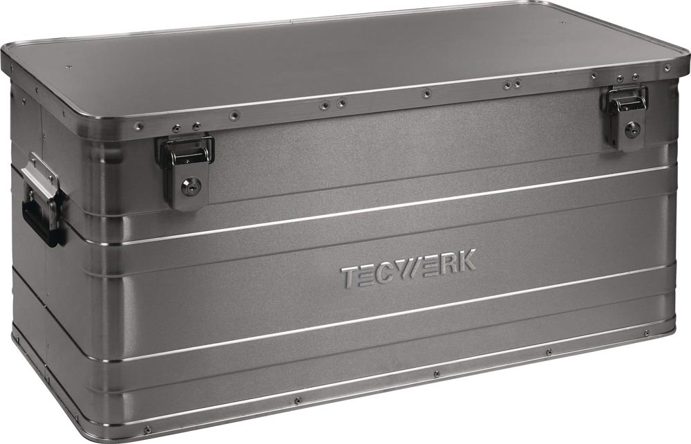 die Aluminiumboxen der Marke TECWERK sind witterungs-, temperatur- und korrosionsbeständig · Hebelspannverschlüsse mit 2 gleichschließenden Zylinderschlössern und Bohrungen für Plomben oder Vorhängeschloss · staub- und spritzwassergeschützt durch umlaufende Gummidichtung im Rahmenprofil · mit Federfallgriffen, kunststoffummantelt · stabiler Deckel · Temperaturbereich: -40 °C bis +180 °C