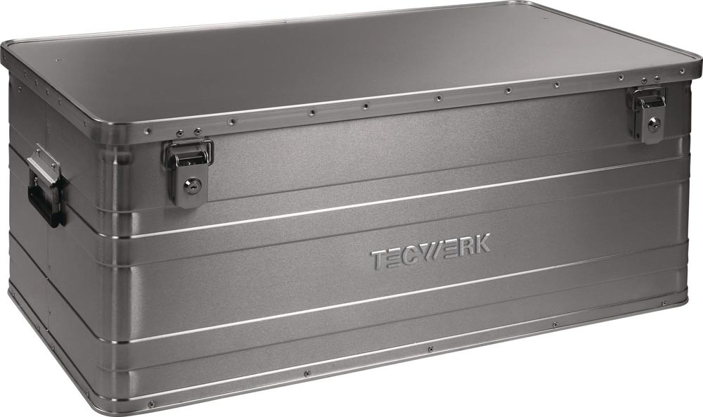 die Aluminiumboxen der Marke TECWERK sind witterungs-, temperatur- und korrosionsbeständig · Hebelspannverschlüsse mit 2 gleichschließenden Zylinderschlössern und Bohrungen für Plomben oder Vorhängeschloss · staub- und spritzwassergeschützt durch umlaufende Gummidichtung im Rahmenprofil · mit Federfallgriffen, kunststoffummantelt · stabiler Deckel · Temperaturbereich: -40 °C bis +180 °C