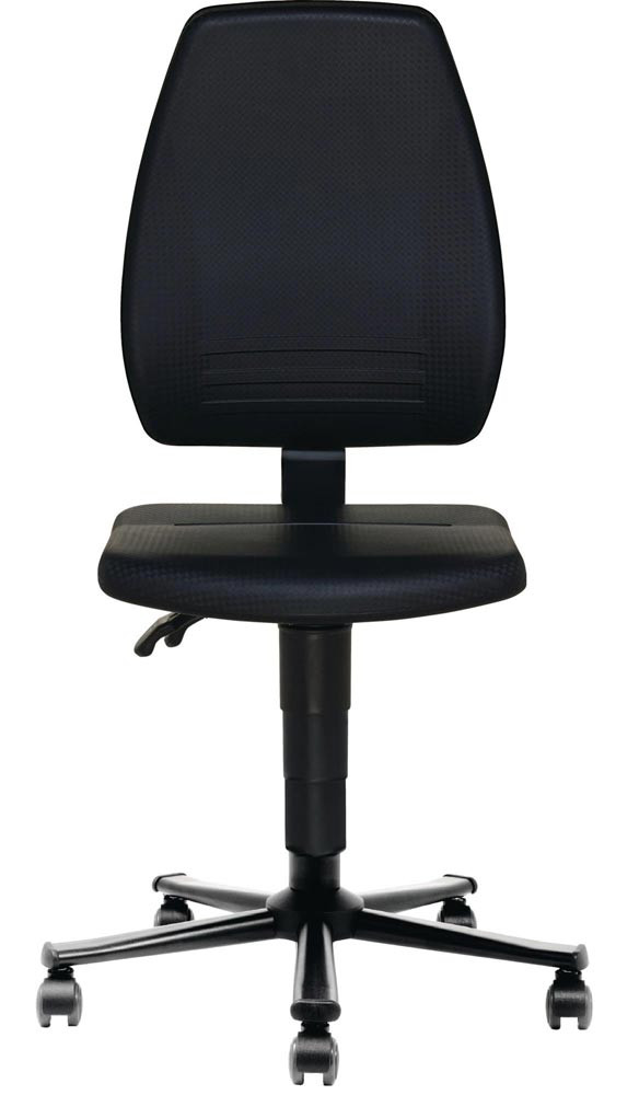 bedienungsfreundliche Gasfeder-Sitzhöhenverstellung · ergonomisch geformter Sitz und Rückenlehne mit robusten Integralschaumpolster beständig gegen leichte Säuren und Laugen, leicht abwaschbar · extra hohe Rückenlehne Höhe 520 mm mit integrierter Lendenwirbelabstützung pendelnd gelagert, mit stufenloser Neigungsverstellung und 10-facher Höhenverstellung · Sitzfläche mit Beckenabstützung und abgerundeter Vorderkante Fünffuß-Untergestell aus stabilem Stahlrohr, flach auslaufend, kipp- und stolpersicher mit lastabhängig gebremsten Sicherheits-Doppelrollen für harte Böden