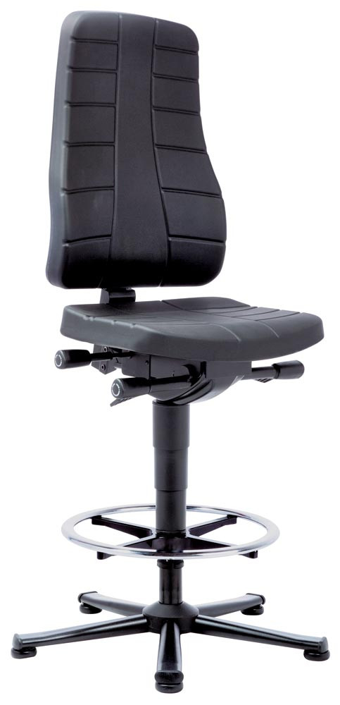 nach DIN 68877 · bedienungsfreundliche Gasfeder-Sitzhöhenverstellung · ergonomisch geformte Sitzfläche und Rückenlehne (extrahoch 600mm) · Synchronmechanik mit Gewichtsregulierung · Sitz in Neigung, Höhe und Tiefe verstellbar · Neigungs- und höhenverstellbare Rückenlehne · Sitz und Rückenlehne mit robustem Integralschaumpolster, beständig gegen leichte Säuren und Laugen, leicht abwaschbar · Untergestell mit abriebfesten Kunststoff-Bodengleitern und höhenverstellbarem Fußring für erhöhte Sitzposition