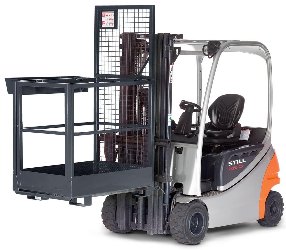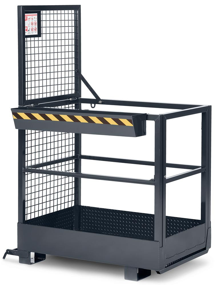 · TÜV geprüfte Sicherheit, entsprechend der DGUV (Deutsche gesetzliche Unfallversicherung) · Stabile Stahlkonstruktion mit rundum Absturzsicherung aus Rohr gemäß UVV · Arbeitskörbe mit TÜV-Zulassung für 2 Personen · Arbeitsplattform aus rutschsicherer Tränenblechkonstruktion mit Abrollschutz · Steckbolzensicherung verhindert das Abrutschen von den Gabelzinken · Pulverbeschichtet · Verzinkte Ausführung auf Anfrage lieferbar ∙ Klappbar auf der Seite der Einfahrtaschen