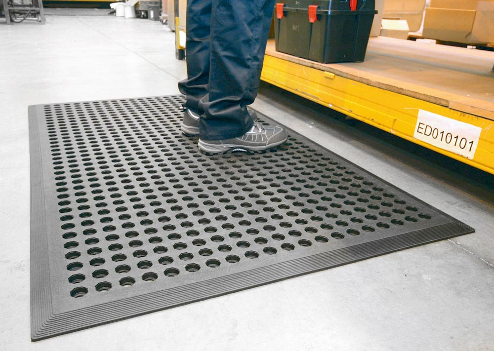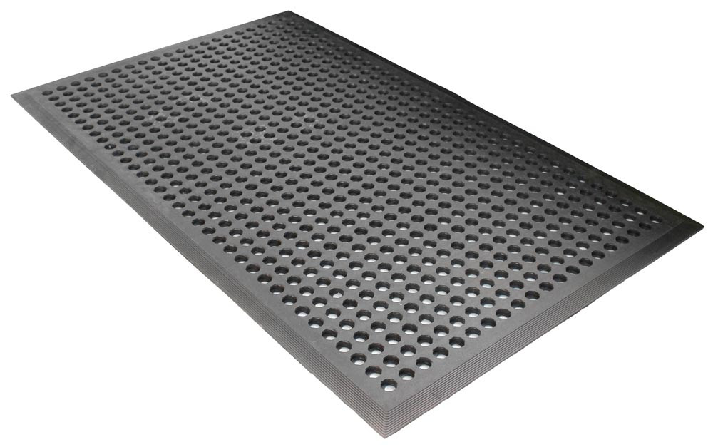· Belastbare, ergonomische Arbeitsplatzmatte · Reduzierung der Rutschgefahr · Erhöhter Stehkomfort · Flüssigkeiten und Späne werden durch die offenen Löcher aufgefangen · Rundum abgeschrägte Kanten