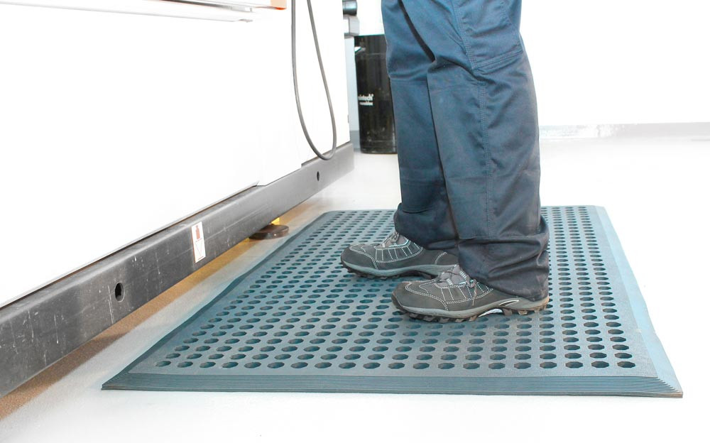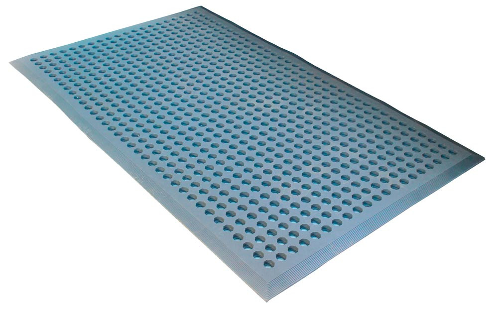 · Belastbare, ergonomische Arbeitsplatzmatte · Reduzierung der Rutschgefahr · Erhöhter Stehkomfort · Flüssigkeiten und Späne werden durch die offenen Löcher aufgefangen · Rundum abgeschrägte Kanten