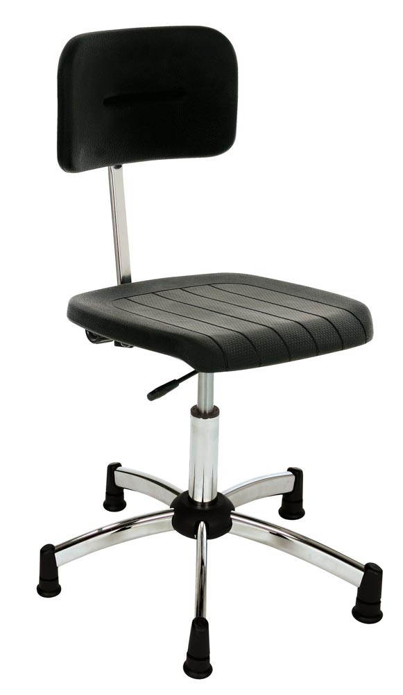 ∙ Elektrisch leitfähig · Nach DIN EN 61340-5-1 · Poliertes Aluminium-Fußkreuz ∙ Sicherheitsgasfeder verchromt ∙ PU-Teile mit Stahleinlegern ∙ Pendelnde Rückenstütze, in der Höhe und Neigung verstellbar · Permanentkontakt einstellbar