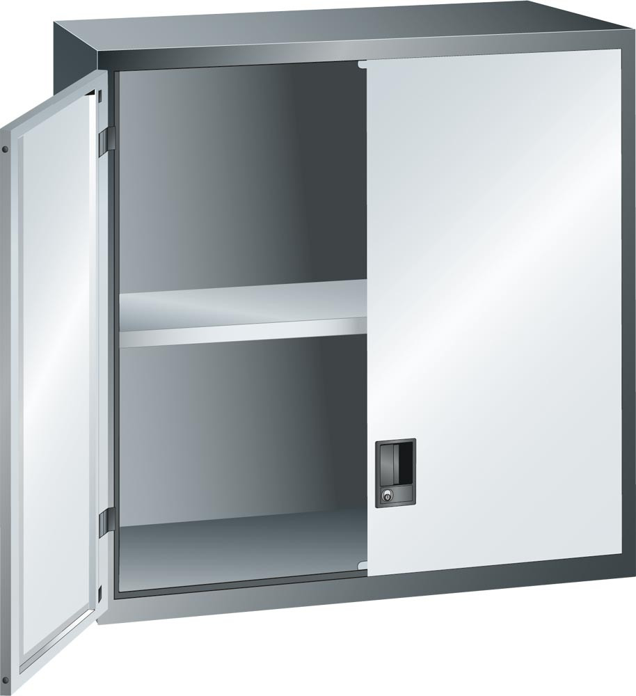 ∙ Aus hochwertigem, pulverbeschichtetem Stahlblech ∙ Flügeltüren, einschlagend aus einem Stück gekantet, Öffnungswinkel 115°, schließen bündig mit dem Gehäuse ab ∙ Inneneinrichtung im 25 mm Raster in der Höhe verstellbar ∙ Inkl. 1 Verstellboden verzinkt, 30 mm stark, max. Traglast 60 kg