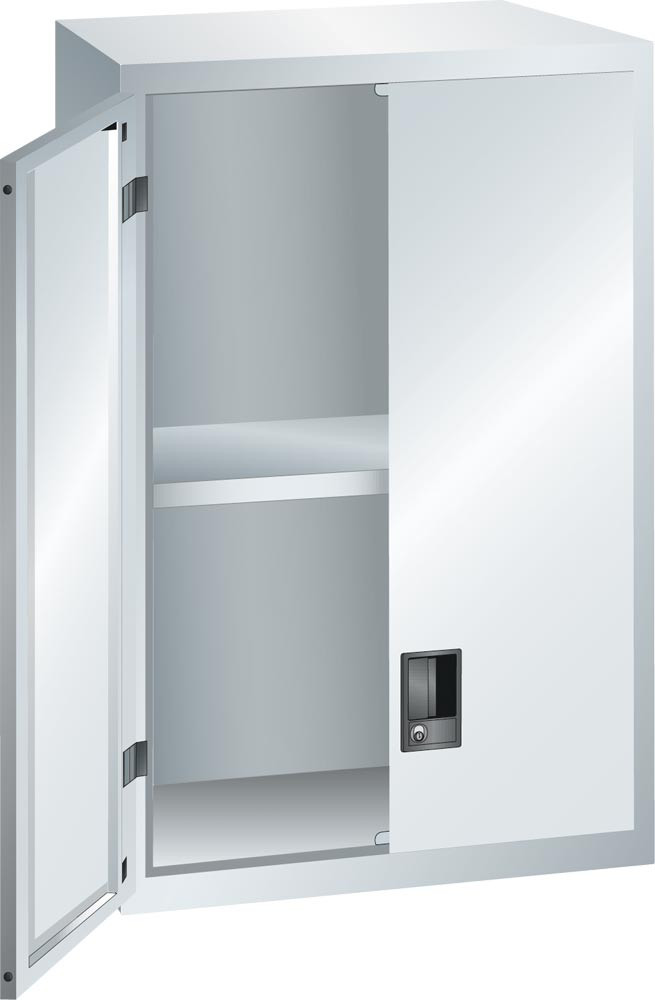 ∙ Aus hochwertigem, pulverbeschichtetem Stahlblech ∙ Flügeltüren, einschlagend aus einem Stück gekantet, Öffnungswinkel 115°, schließen bündig mit dem Gehäuse ab ∙ Inneneinrichtung im 25 mm Raster in der Höhe verstellbar ∙ Inkl. 1 Verstellboden verzinkt, 30 mm stark, max. Traglast 60 kg