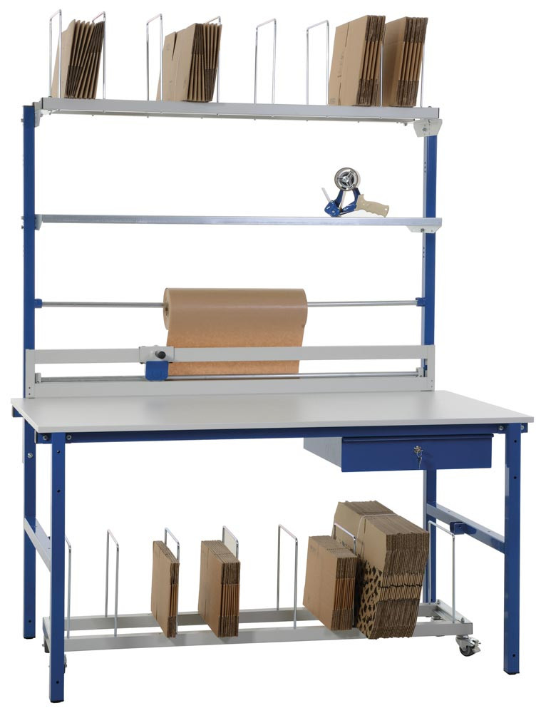 ∙ Packtische zur individuellen Bestückung mit unterschiedlichen Ausstattungs- und Erweiterungsmöglichkeiten ∙ Stabile Stahlrohr-Konstruktion 40 x 40 x 2 mm, pulverbeschichtet in RAL 5010 enzianblau ∙ E1-Spanplatte, 19 mm stark, Flächenlast 100 kg, melaminharzbeschichtet ähnl. RAL 7035 lichtgrau ∙ Mit höhenverstellbaren Nivellierschrauben zum Ausgleich von Bodenunebenheiten