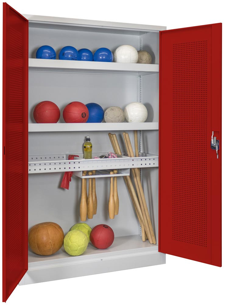 Ballschrank m. Lochblech Flügeltüren, BxTxH 1200x500x1950 mm, 2 Böden, 2 Längs- 2 Quertraversen,Trennsteg, Keulenhalter, Schloss, RAL 7035/3003