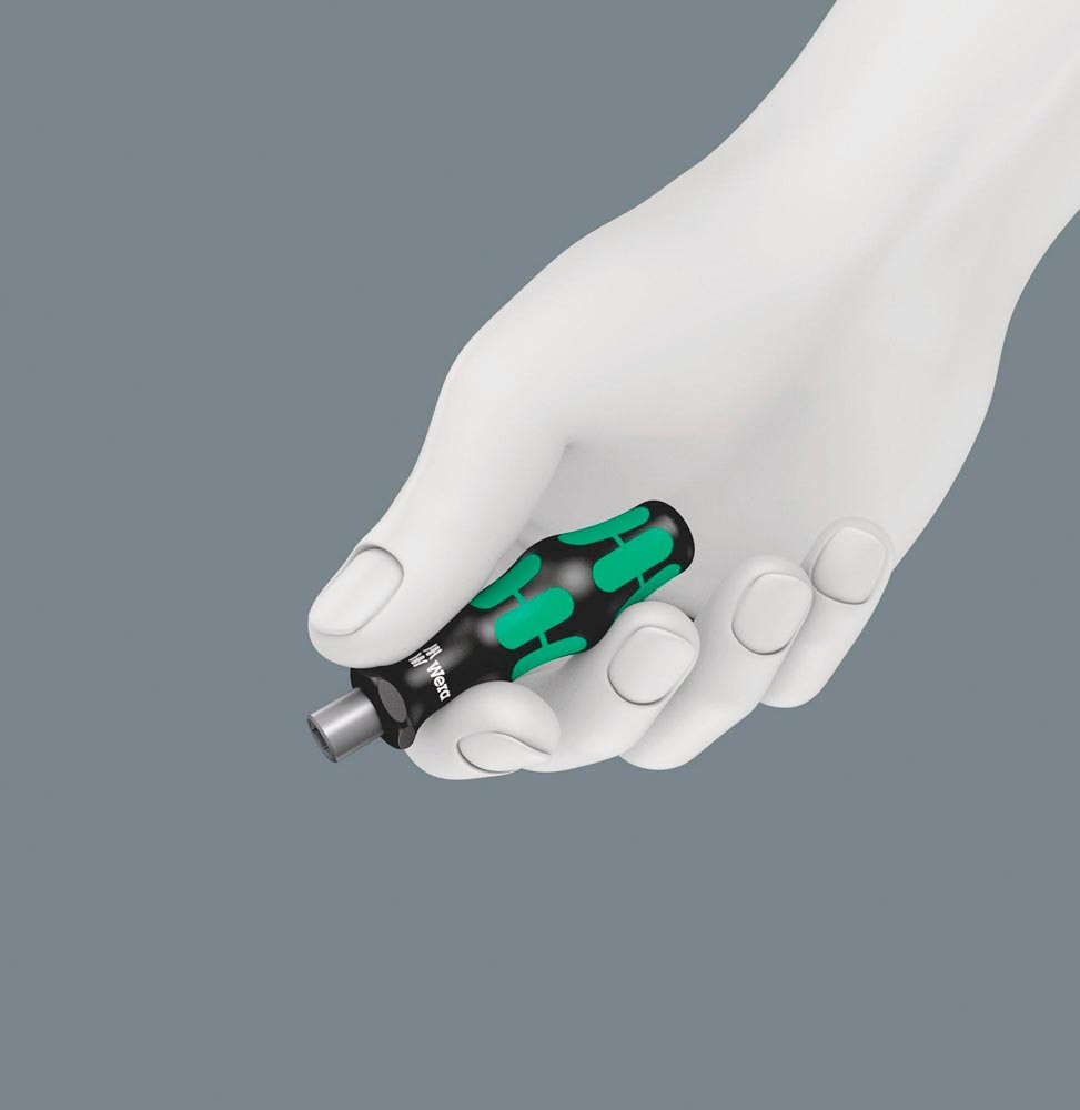 Hochwertiger Bit-Handhalter. Der Magnet sorgt für den sicheren Sitz des Bits im Halter. Kraftform Plus Griff für angenehm ergonomisches Arbeiten · bei dem Blasen und Schwielen vermieden werden. Harte Griffzonen für hohe Arbeitsgeschwindigkeit · während weiche Griffzonen hohe Drehmomentübertragung garantieren. Geeignet für Bits mit 1/4″-Außensechskantantrieb nach DIN ISO 1173-C 6,3 und E 6,3 sowie Wera Anschluss-Reihen 1 und 4.