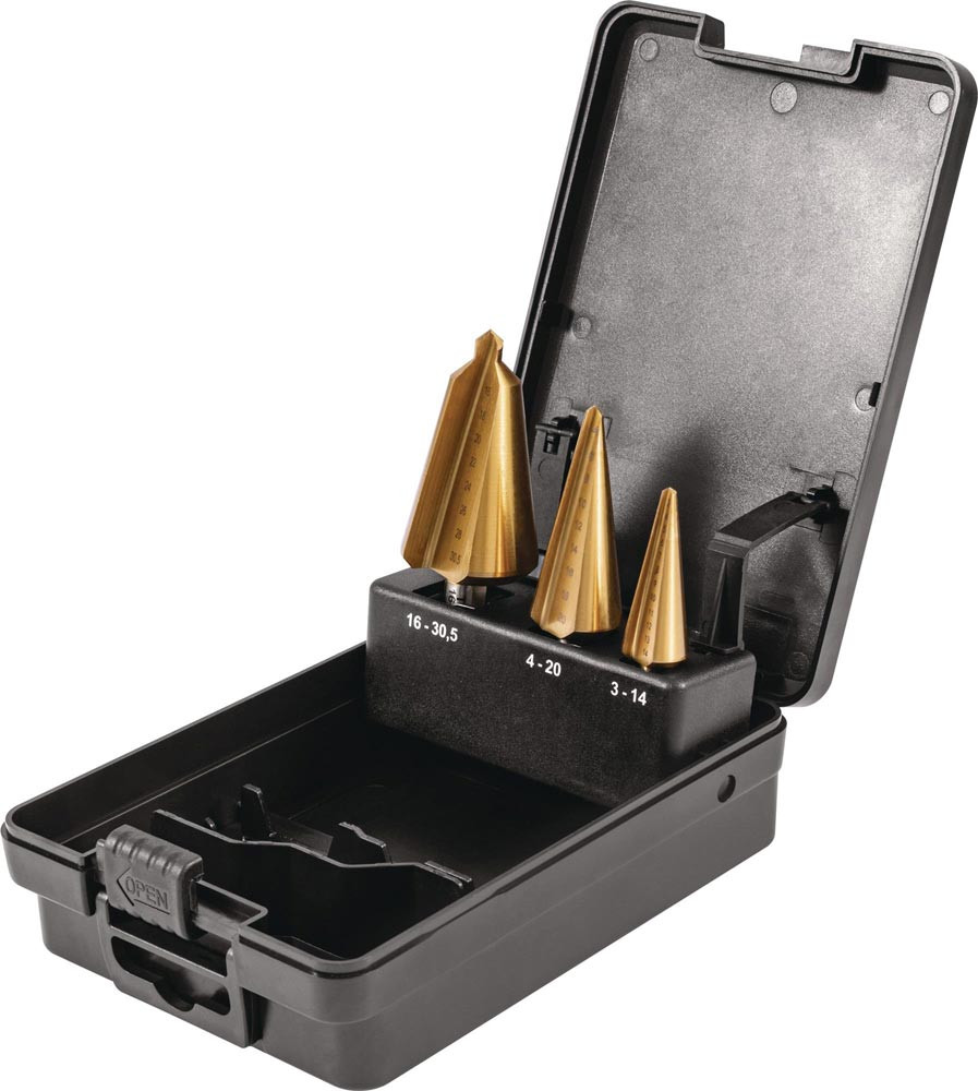Blechschälbohrersatz 3-14/4-20/16-30,5 mm HSS 3 teilig Kunststoffkassette E6498542