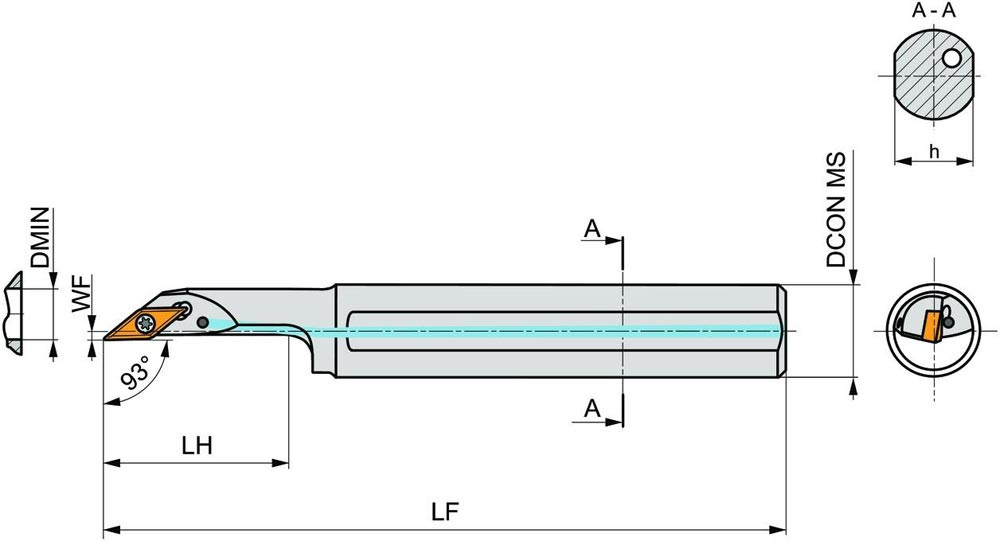 Dreh-Bohrstange mit Schraubklemmung zum spannen von 35° Rhombus positive Wendeschneidplatten mit einem Innenkreisdurchmesser von 6.35mm · 3.18mm Dick (ISO Bezeichnung VB.. 1103.. ) · linke Ausführung zum 93° Stirndrehen mit abgesetzem Schaft · Stahl mit Kühlkanalbohrung · 25mm Durchmesser x 250mm Länge für Stirnkopierdrehen
