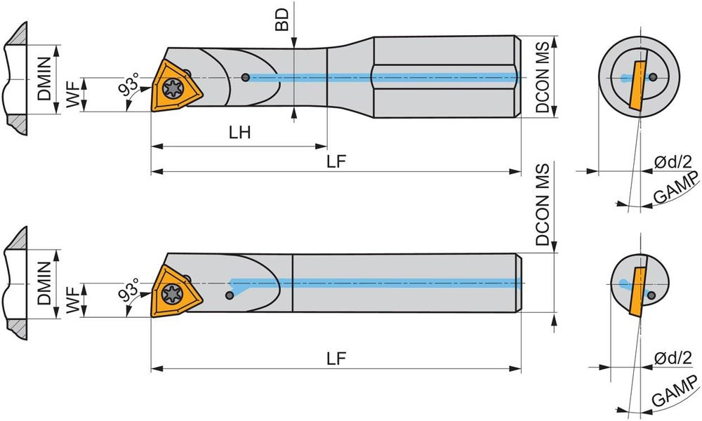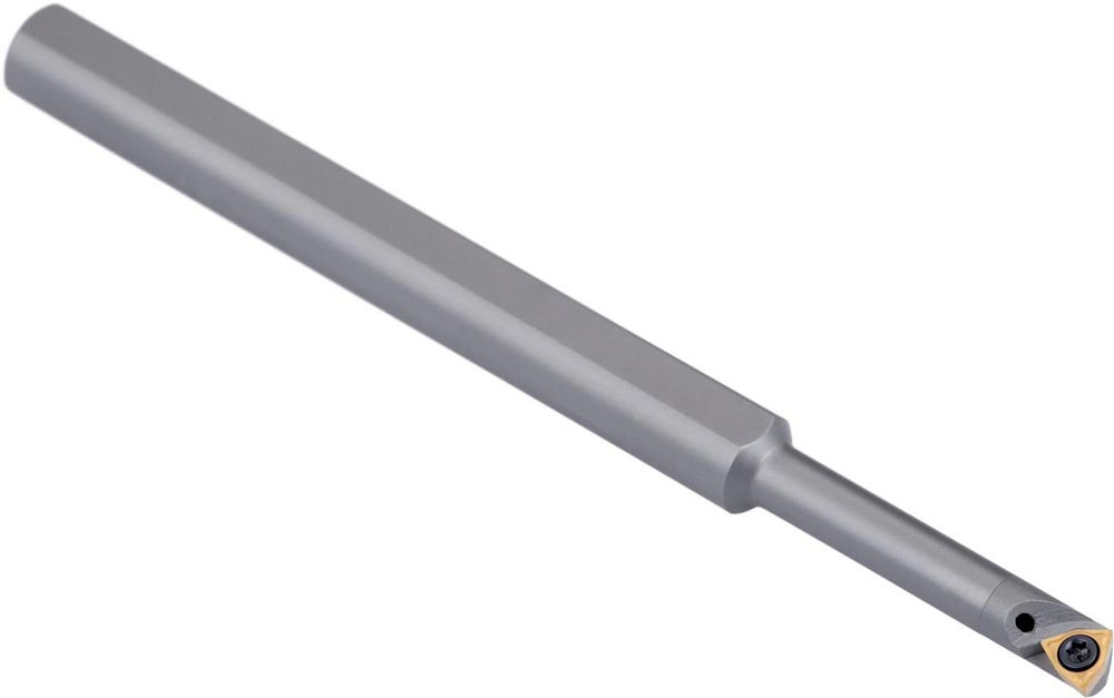 Dreh-Bohrstange mit Schraubklemmung zum spannen von 80° Trigonal positive Wendeschneidplatten mit einem Innenkreisdurchmesser von 3.97mm · 1.59mm Dick (ISO Bezeichnung WC.. 0201.. ) · linke Ausführung zum 93° Längsdrehen mit abgesetzem Schaft · Hartmetall mit Kühlkanalbohrung · 5mm Durchmesser x 100mm Länge für Innenkegeldrehen und Längsdrehen mit und ohne Schulter