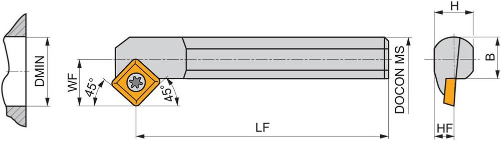 Dreh-Bohrstange mit Schraubklemmung zum spannen von Viereckig positive Wendeschneidplatten mit einem Innenkreisdurchmesser von 9.525mm · 3.97mm Dick (ISO Bezeichnung SC.. 09T3.. ) · linke Ausführung zum 45° Stirndrehen mit abgesetzem Schaft · Stahl ohne Kühlkanalbohrung · 25mm Durchmesser x 300mm Länge für Innenentgraten · Innenkegeldrehen · Kopierdrehen in einer und mehreren Richtungen und Rückwärtsentgraten