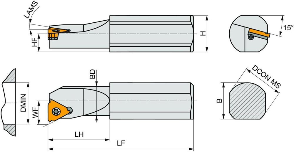 Schraubgeklemmte Gewindebohrstange mit 1° Helixwinkel zum spannen einer dreieckigen Wendeschneidplatte mit einem Innenkreisdurchmesser von 6.35mm (Bezeichnung TN 11NR.. ) · rechte Standardausführung mit Zylinderschaft aus Stahl ohne Kühlmittelbohrung · 16mm Durchmesser 150mm Gesamtlänge zum Innengewinden · einstechen von Sicherungsringen · und einstechen von O-Ringen