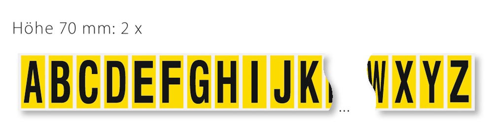 Buchstaben A-Z, selbstklebend, Schrifthöhe 70 mm, VE 208 Etiketten mit 8xA-Z, Schrift schwarz, Etikett gelb