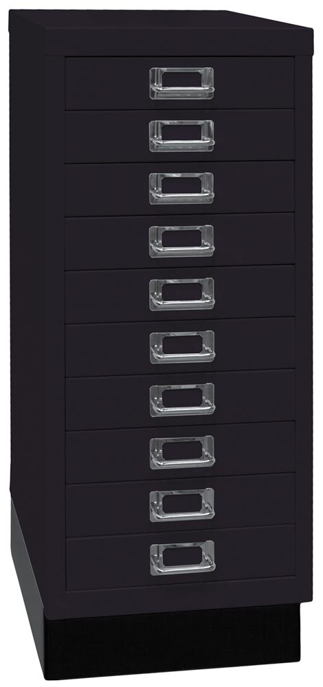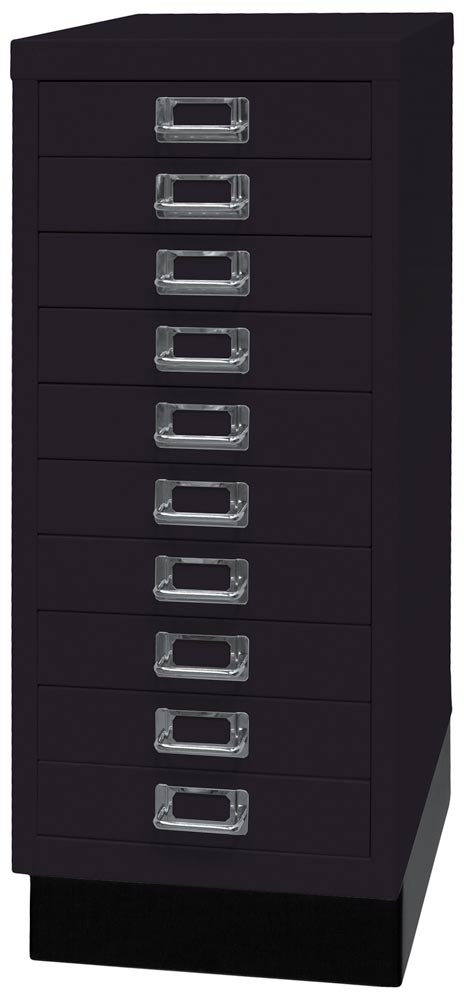 Büro-Schubladenschrank, BxTxH 279x380x670 mm, 10 Schubladen 51 mm, DIN A4, Sockel 80 mm hoch, schwarz
