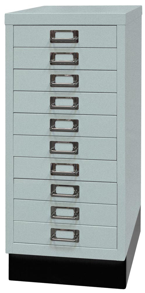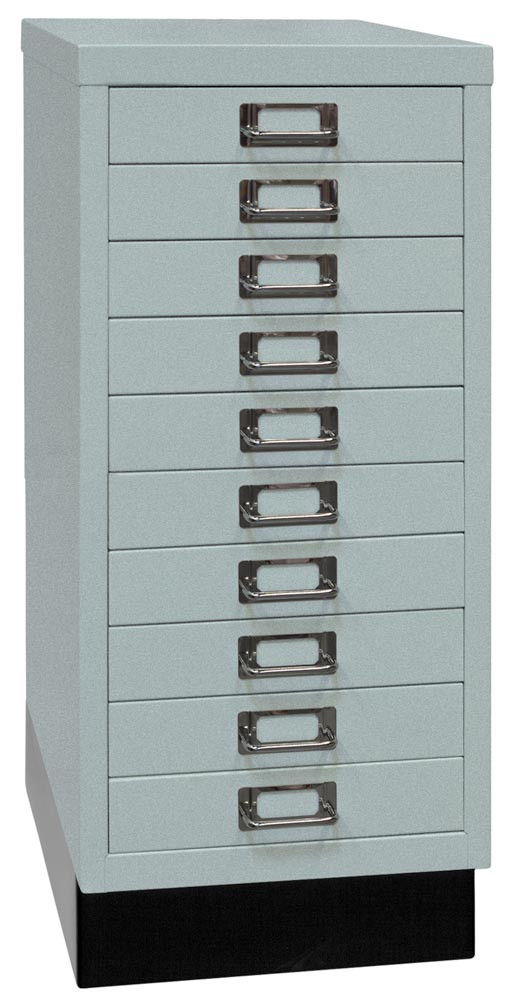Büro-Schubladenschrank, BxTxH 279x380x670 mm, 10 Schubladen 51 mm, DIN A4, Sockel 80 mm hoch, silber
