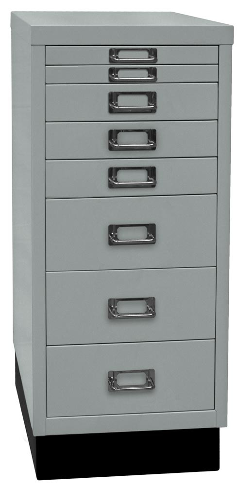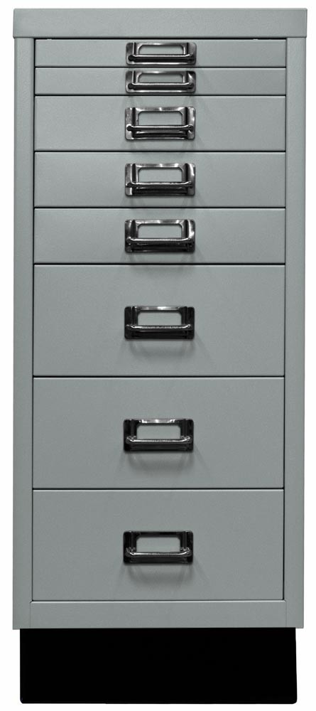Büro-Schubladenschrank, BxTxH 279x380x670 mm, 8 Schubladen 2x25, 3x51, 3x102 mm, DIN A4, Sockel 80 mm hoch, silber