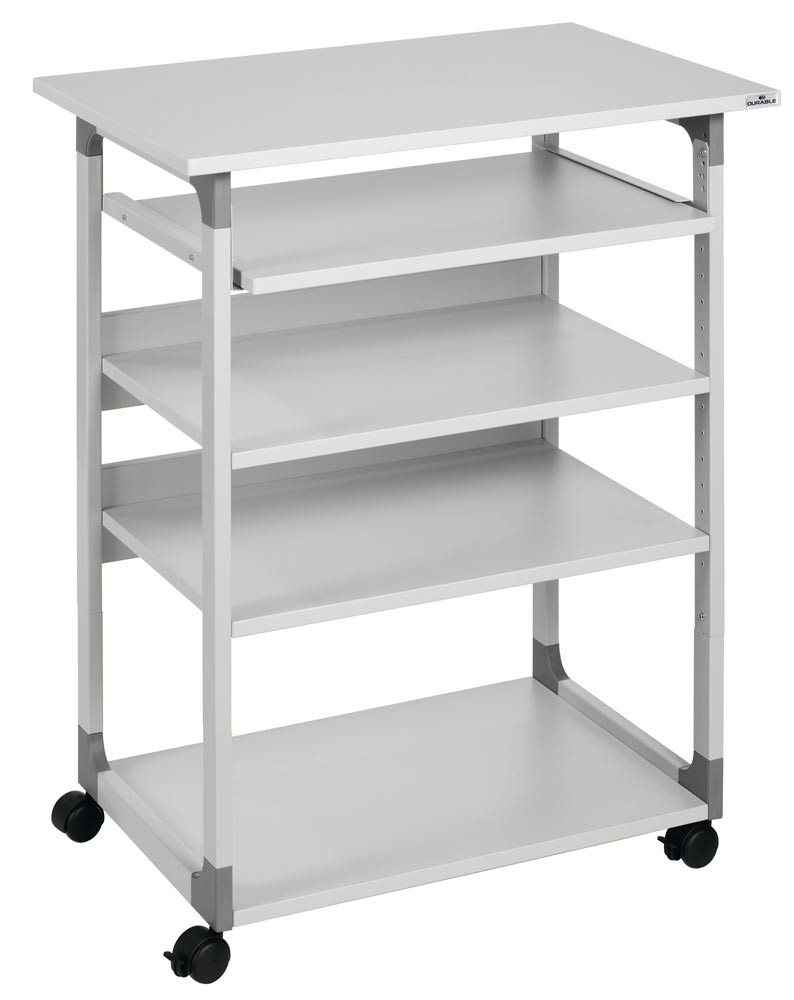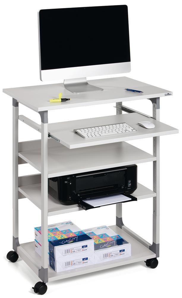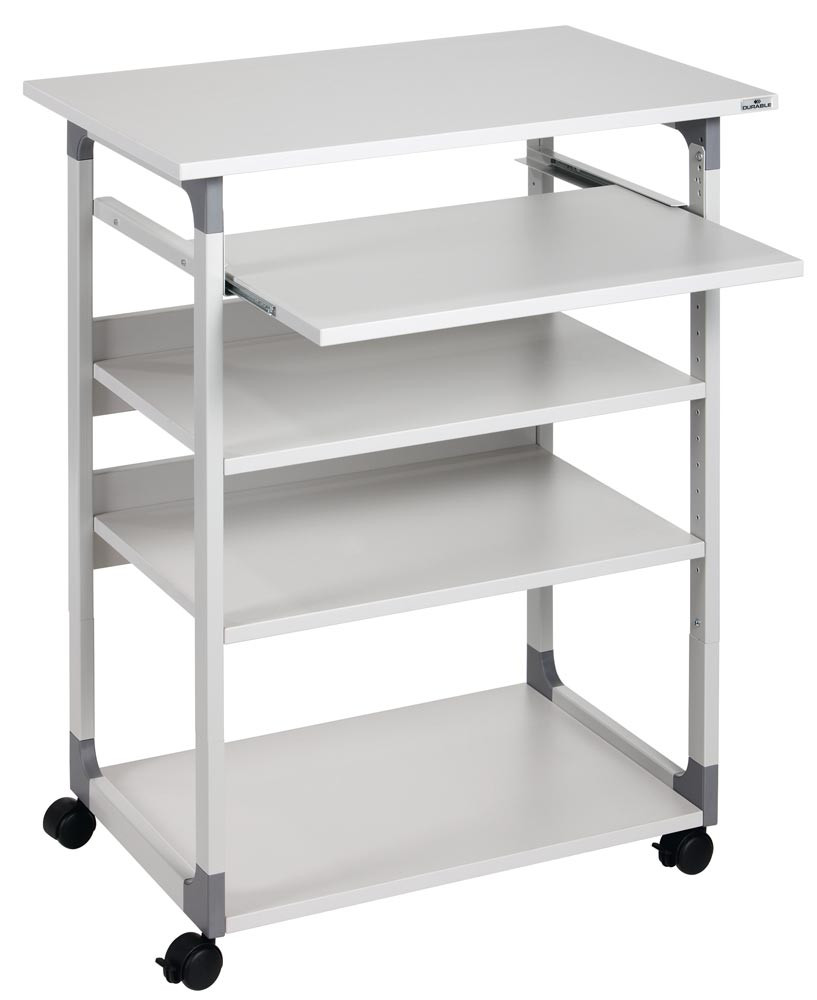 Computertisch, BxTxH 750x534x950-1150 mm, 4 Böden, höhenverstellbarer Tastaturauszug, fahrbar, lichtgrau EP522159