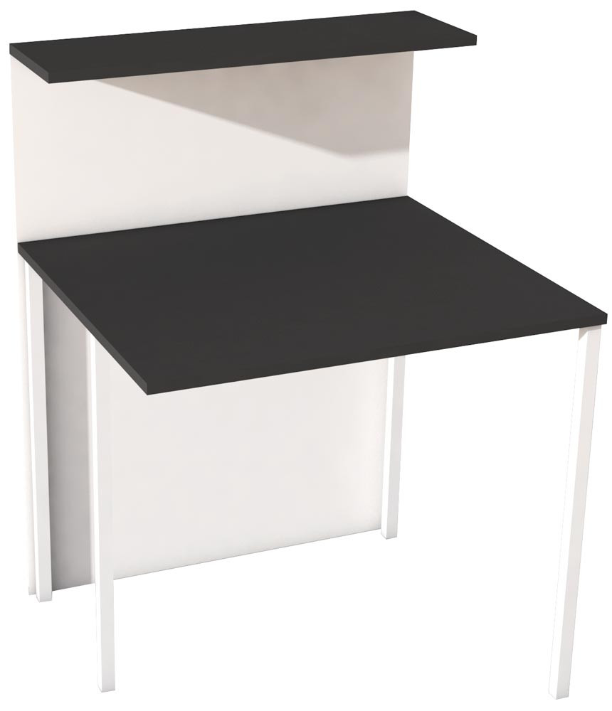 ∙ Stahl-/Holzkonstruktion ∙ Thekenkörper aus Metall in weiß mit dekorativen Edelstahlstreifen ∙ Melaminharzbeschichtete Holzplatten mit ABS-Kante in anthrazit ∙ Kabeldurchlässe in der Arbeitsplatte ∙ Hinter den 1100 mm hohen Fronten befindet sich ein vollwertiger Arbeitsplatz mit einer Tiefe von 800 mm und einer Höhe von 740 mm ∙ Beliebig erweiterbar durch Anbauelement