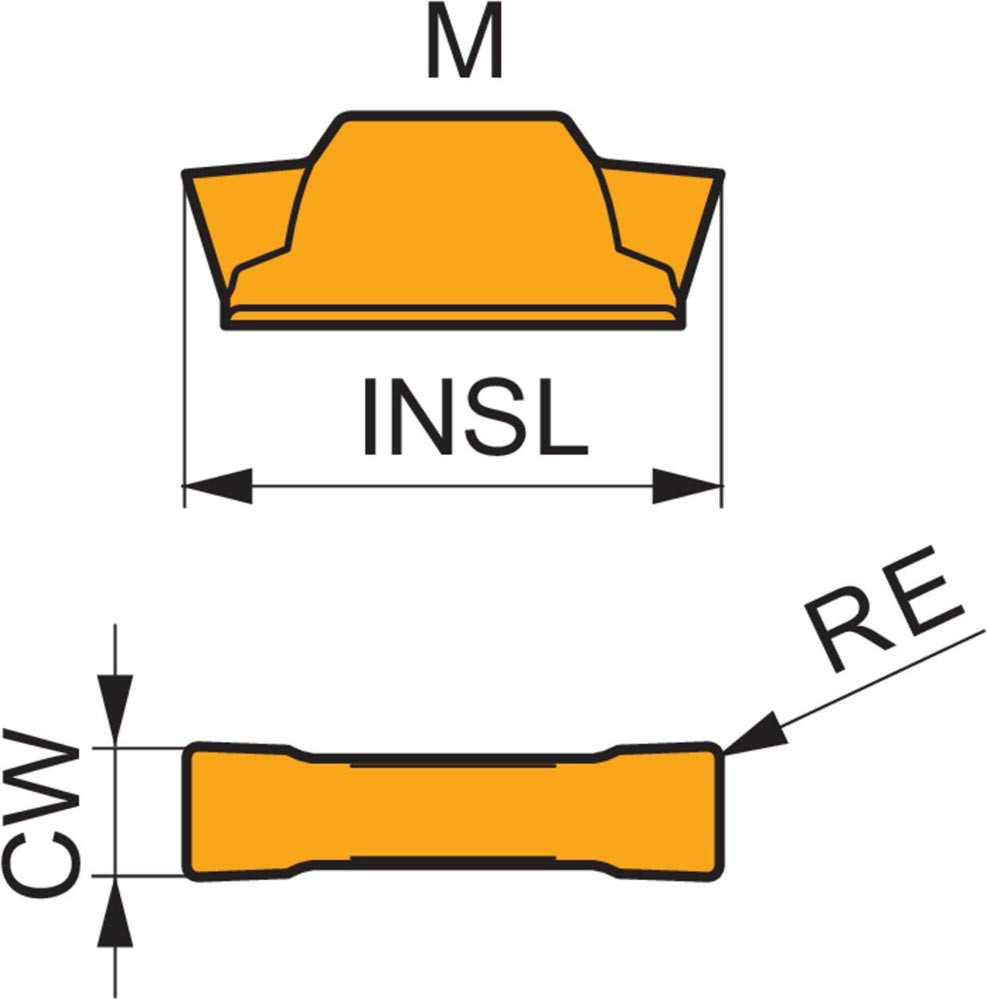 Doppelseitige Ein-und Abstech Wendeschneidplatte · 16.4mm lang mit einer 5mm Schnittbreite und einem 0.8mm Eckenradius · eine Genauigkeit nach Toleranzklasse M und einem Spanbrecher M · Substrat T9325 MT-CVD beschichtetes Funktionskorn WC-Co Hartmetall im ISO-Substrats-Bereich P15-P35 und K15-K35 zur Bearbeitung von Stahl und Guss in Kombination mit DORMER PRAMET GF..(RL) 05 und XLCCN 0516 Ein-und Abstechwerkzeugen