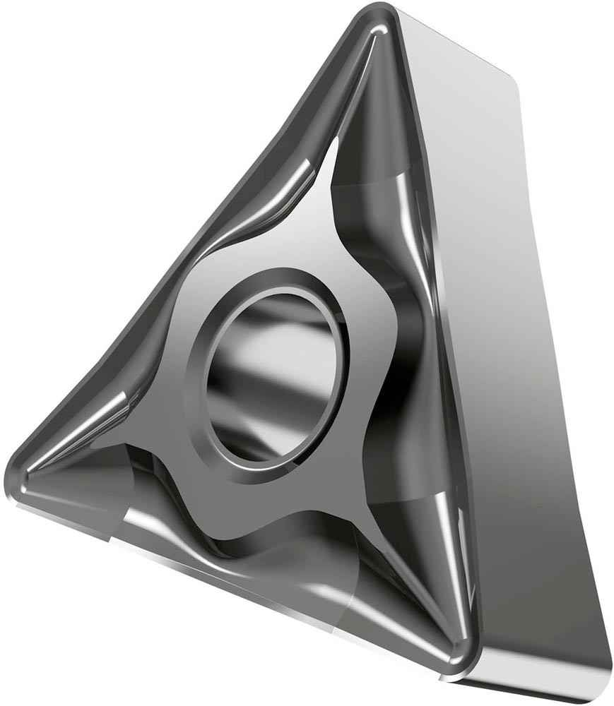 Doppelseitige negative Drehwendeschneidplatte · Triangular mit Innenkreisdurchmesser von 9.525mm · 4.76mm Dick · 0.4mm Radius · Indexgenauigkeit nach ISO-Toleranzklasse-M · Spanbrecher NF mit verrundeter Schneidkante · im Substrat HF7 · unbeschichtet WC-Co Feinkornsubstrat · zum schlichten bis medium bearbeiten