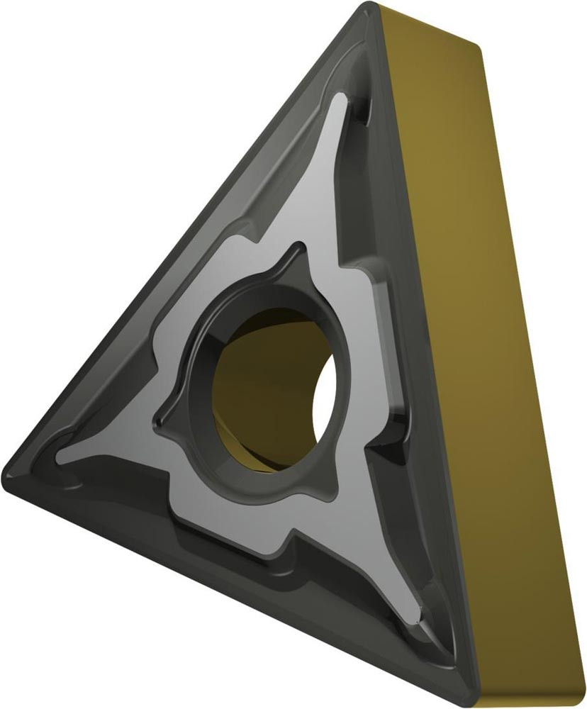Doppelseitige negative Drehwendeschneidplatte · Triangular mit Innenkreisdurchmesser von 9.525mm · 4.76mm Dick · 0.8mm Radius · Indexgenauigkeit nach ISO-Toleranzklasse-M · Spanbrecher M mit verrundeter Schneidkante · im Substrat T9415 · MT-CVD beschichtet WC-Co Substrat im ISO-Bereich P05 -P30 · zum schlichten bis schruppen bearbeiten von Stählen