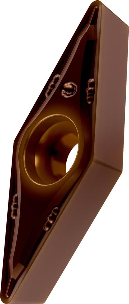 Einseitige positive Drehwendeschneidplatte · 35° Rhombisch mit 5° Freiwinkel · Innenkreisdurchmesser von 6.35mm · 3.18mm Dick · 0.8mm Radius · Indexgenauigkeit nach ISO-Toleranzklasse-M · Spanbrecher FM mit verrundeter Schneidkante · im Substrat T8430 · PVD beschichtet WC-Co Feinkornsubstrat in den ISO-Bereichen P20 -P40 und M20 -M35 · zum schlichten bis medium bearbeiten von Stählen und nichtrostenden Stählen