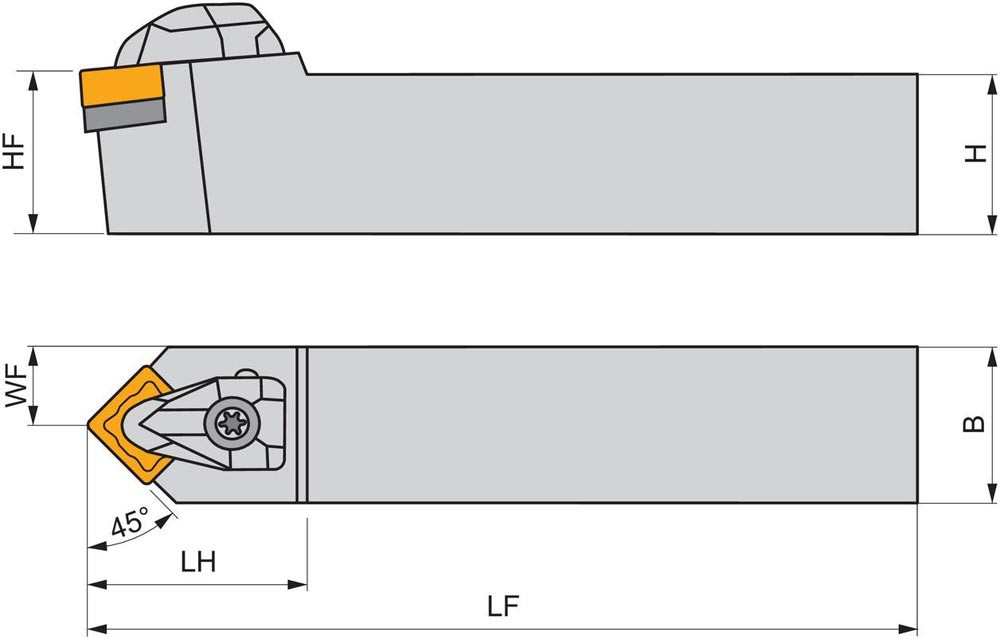 Dreh-Trägerwerkzeug doppelt geklemmt zum spannen von Viereckig negative Wendeschneidplatten mit einem Innenkreisdurchmesser von 12.7mm · 4.76mm Dick (ISO Bezeichnung SN.. 1204.. ) · neutrale Ausführung zum 45° Stirndrehen mit Zylinderschaft · 25mm Werkzeughöhe x 25mm Breite x 150mm Länge für entgraten · Kegeldrehen · Kopierdrehen in einer und mehreren Richtungen und Längsdrehen ohne Schulter