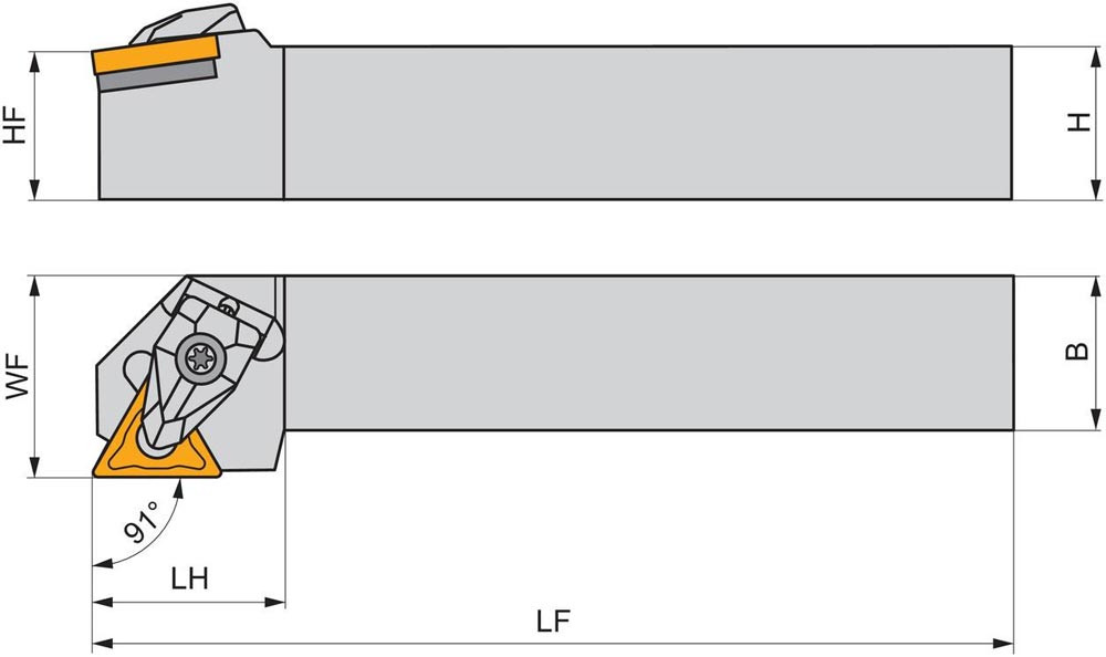 Dreh-Trägerwerkzeug doppelt geklemmt zum spannen von Triangular negative Wendeschneidplatten mit einem Innenkreisdurchmesser von 9.525mm · 4.76mm Dick (ISO Bezeichnung TN.. 1604.. ) · rechte Ausführung zum 90° Stirndrehen mit abgesetzem Schaft · 25mm Werkzeughöhe x 25mm Breite x 150mm Länge für Kegeldrehen und Längsdrehen mit und ohne Schulter