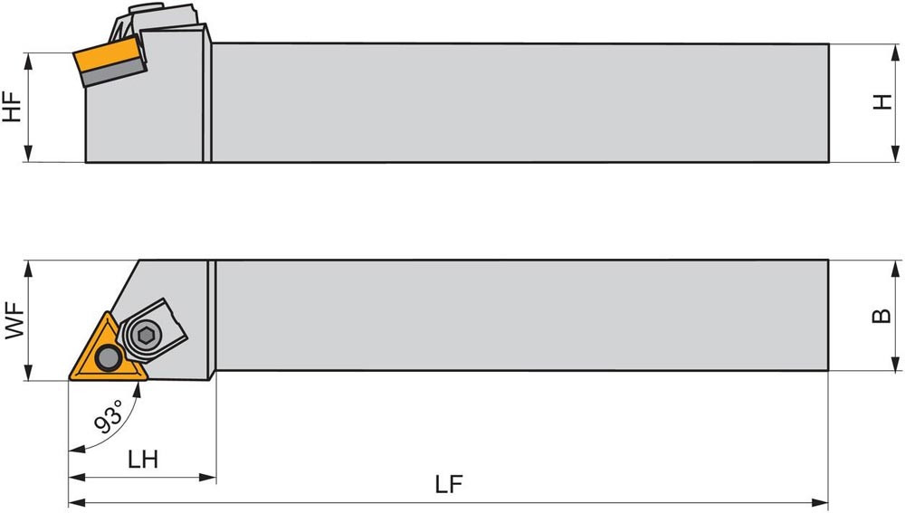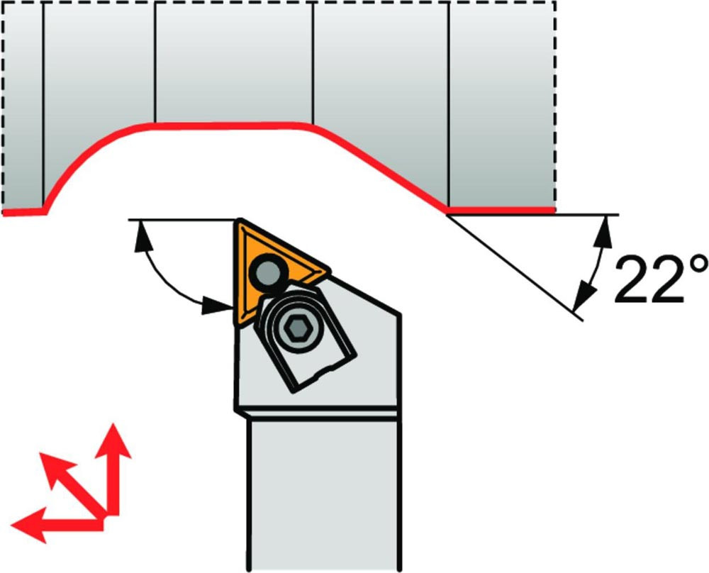 Dreh-Trägerwerkzeug multi lock zum spannen von Triangular negative Wendeschneidplatten mit einem Innenkreisdurchmesser von 9.525mm · 4.76mm Dick (ISO Bezeichnung TN.. 1604.. ) · rechte Ausführung zum 93° Stirndrehen mit abgesetzem Schaft · 20mm Werkzeughöhe x 20mm Breite x 125mm Länge für entgraten · Kegeldrehen · Kopierdrehen in einer und mehreren Richtungen und Längsdrehen mit und ohne Schulter