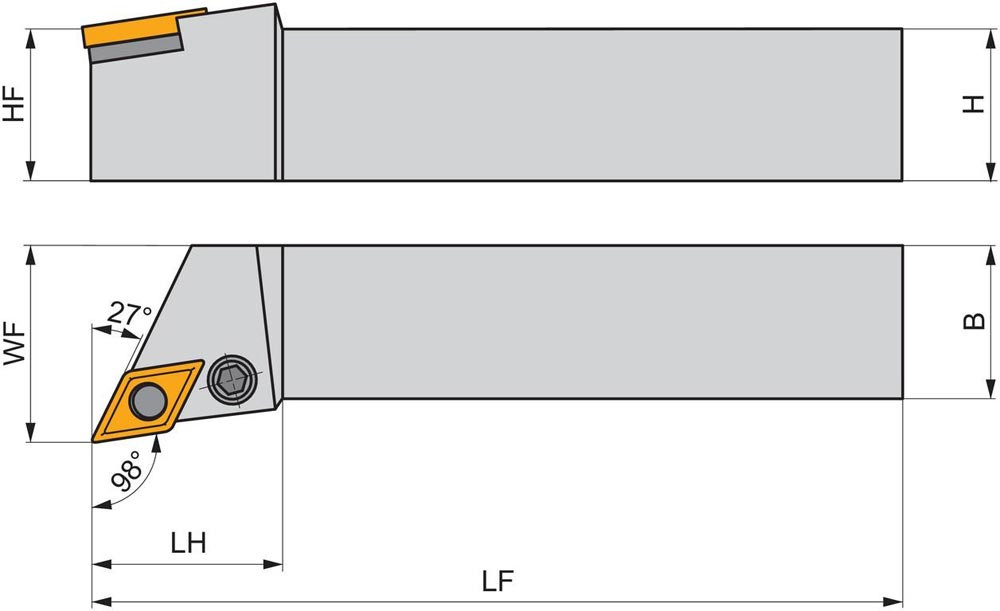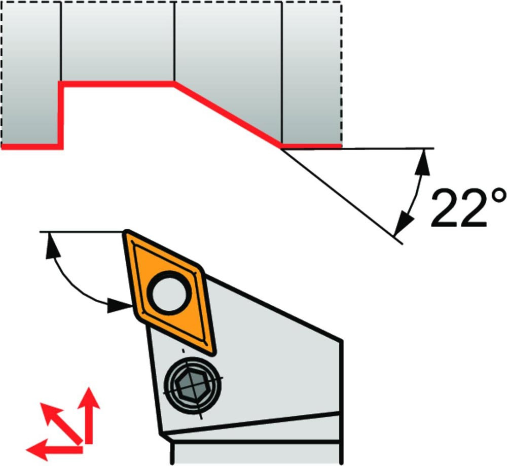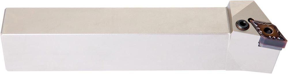 Dreh-Trägerwerkzeug mit Kniehebelklemmung zum spannen von 55° Rhombus negative Wendeschneidplatten mit einem Innenkreisdurchmesser von 12.7mm · 6.35mm Dick (ISO Bezeichnung DN.. 1506.. ) · linke Ausführung für Sonderanwendungen · 25mm Werkzeughöhe x 25mm Breite x 150mm Länge für Kegeldrehen · Kopierdrehen in einer und mehreren Richtungen und Längsdrehen mit und ohne Schulter