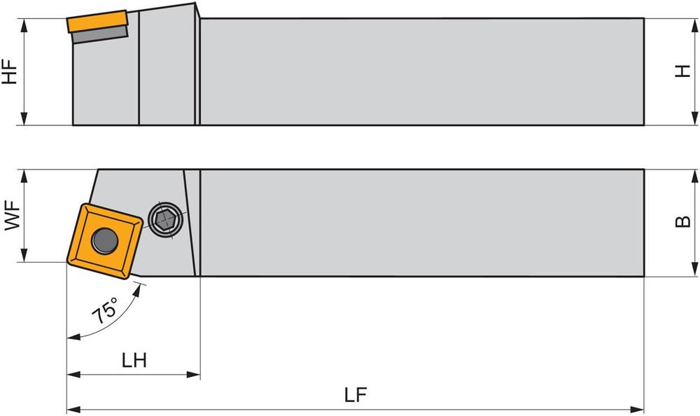 Dreh-Trägerwerkzeug mit Kniehebelklemmung zum spannen von Viereckig negative Wendeschneidplatten mit einem Innenkreisdurchmesser von 25.4mm · 7.94mm Dick (ISO Bezeichnung SN.. 2507.. ) · linke Ausführung zum 75° Stirndrehen mit Zylinderschaft · 50mm Werkzeughöhe x 50mm Breite x 300mm Länge für Kegeldrehen und Längsdrehen ohne Schulter