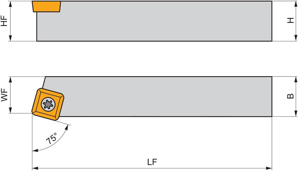 Dreh-Trägerwerkzeug mit Schraubklemmung zum spannen von Viereckig positive Wendeschneidplatten mit einem Innenkreisdurchmesser von 25.4mm · 9.52mm Dick (ISO Bezeichnung SC.. 2509.. ) · rechte Ausführung zum 75° Stirndrehen mit Zylinderschaft · 40mm Werkzeughöhe x 40mm Breite x 250mm Länge für Kegeldrehen und Längsdrehen ohne Schulter