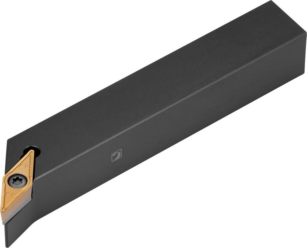 Dreh-Trägerwerkzeug mit Schraubklemmung zum spannen von 35° Rhombus positive Wendeschneidplatten mit einem Innenkreisdurchmesser von 9.525mm · 4.76mm Dick (ISO Bezeichnung VB.. 1604.. oder VC.. 1604.. ) · rechte Ausführung zum 107°30' Stirndrehen mit abgesetzem Schaft · 25mm Werkzeughöhe x 25mm Breite x 150mm Länge für Kegeldrehen · Kopierdrehen in einer und mehreren Richtungen und Längsdrehen mit und ohne Schulter