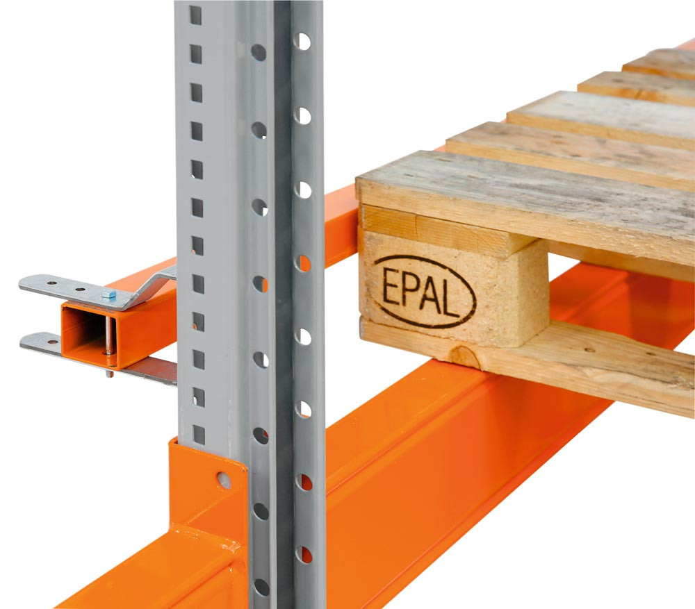 · Verhindert das Durchschieben der Paletten im Fach · Rechteckrohr in RAL 2004 reinorange · Verzinkter Halter mit 3 Positionsbohrungen mit Abstand 75/100/125 mm