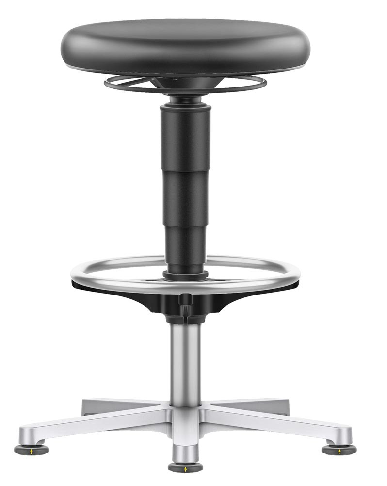 · Sehr großer Sitzhöhenverstellbereich · Höhenverstellung durch Ringauslösung · Fugenarm, leicht zu reinigen, desinfizierbar · Fußkreuz aus Aluminium Ø 540 mm · Platzsparend und leicht mobil · Für Industrie, Dienstleistungen und Labor · Schwarzer Farbring zum Schutz der Polster · ESD-konform nach EN 61340-5-1
