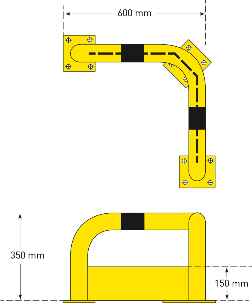 Eck-Rammschutz-Bügel, mit Unterfahrschutz, Rundrohr 76/3 mm, zum Aufdübeln, Innenbereich, Farbe gelb/schwarz, BxTxH 600x600x350 mm