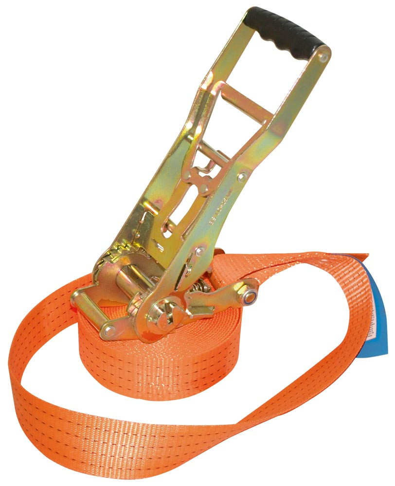 Einteiliger Zurrgurt, Langhebel-Umkehrratsche, 4000 daN Zugkraft i. d. Umr., Gurtbreite 50 mm, Länge 10 m, Farbe orange, 4 Streifen, VE 2 Stück