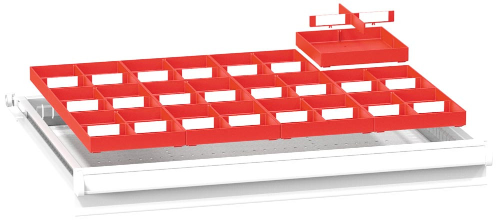 Einteilungsmaterial-Set, 18 Boxen 153x153x25 mm, 18 große Trenneinsätze, 36 kleine Trenneinsätze, für FH 75 mm, passend für Gehäusegr. BxT 1037x600 mm EP533533